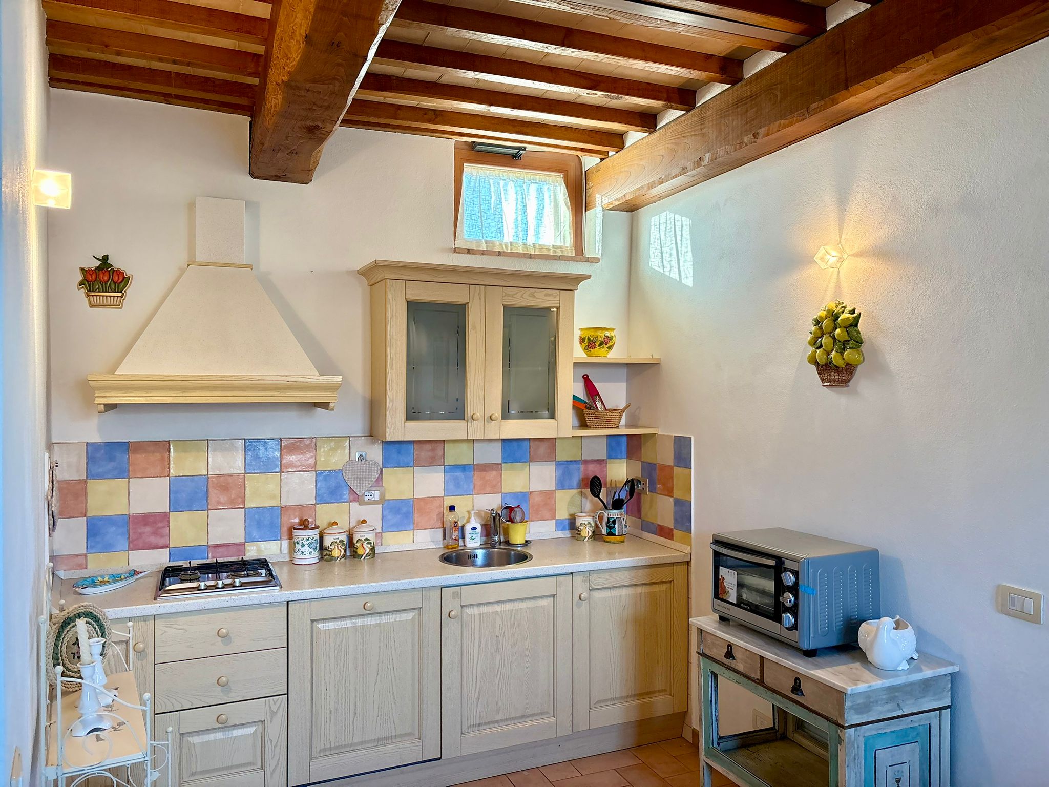 The spaces flow seamlessly between the intimate master bedroom, where the silence of ancient stone walls guarantees a regenerative rest, and the bright living area that opens onto the poetic landscape of the Val d’Orcia. The residence is completed by a private kitchen, where functionality meets a refined and welcoming aesthetic.